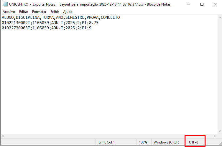 Arquivo UTF8 com notas formatado
