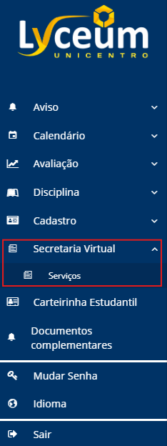 Na solicitação de serviços o aluno consegue fazer a solicitação de serviços de autoatendimento ou para a Secretaria. Para isso basta acessar '''Secretaria Virtual''' -> '''Serviços''' no Menu Lateral. | |||