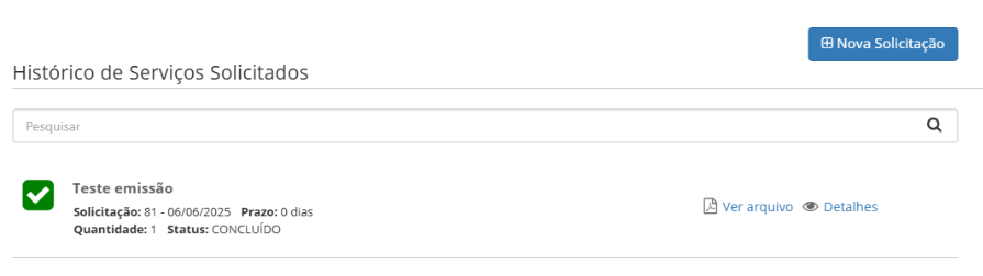 Ao acessar o menu Serviços é possível visualizar o histórico de solicitações realizadas e suas informações. Se o serviço for a emissão de um documento, é possível visualizar o arquivo clicando sobre o botão Ver arquivo.